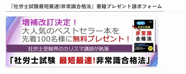 • 資料請求フォーム内の「請求内容」欄にて「社労士試験最短最速非常識合格法書籍」にチェックを入れておく必要がある