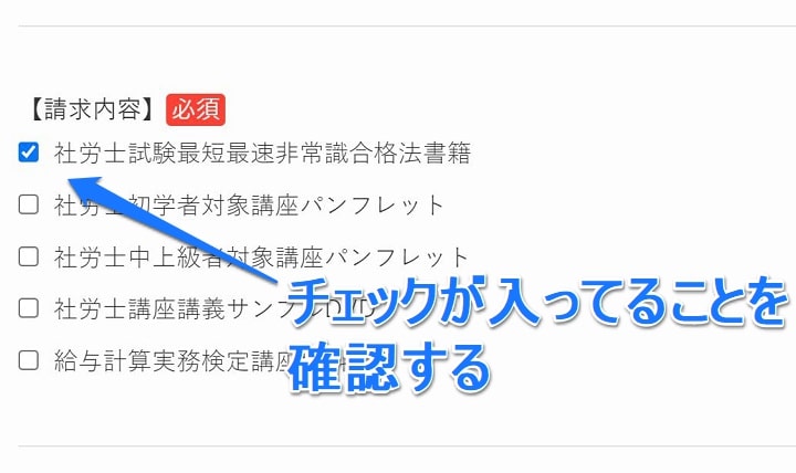 基本的にはページ遷移時点で「社労士試験最短最速非常識合格法書籍」のところにチェックが入っているので、基本的には触る必要はありませんが、念のため最後の申込みボタンを押す前に確認しておきましょう。