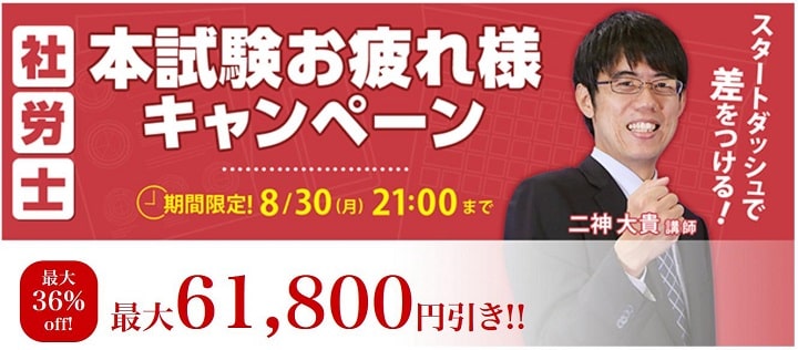 キャンペーン期限が2021年08月30日(月) 21時までとなってますので、来年度に社労士講座の受講を検討されてる方はぜひチェックしておきましょう!
